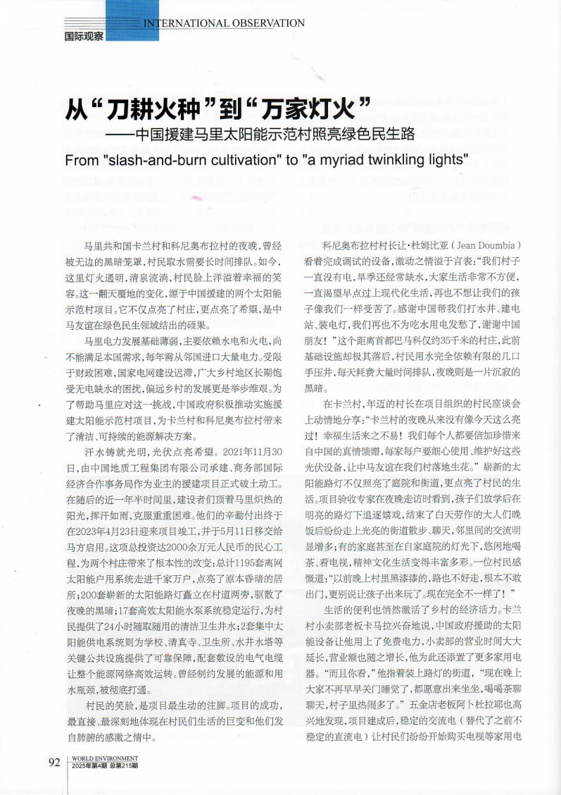 近日,由生态环境部与联合国环境规划署联合创办的《世界环境》杂志专篇报道了中国地质承建的中国援马里太阳能示范村项目案例。该项目是中国援助在民生领域推广清洁能源、分享绿色发展经验的又一务实举措,对助力马里走绿色可持续发展之路具有现实意义。现全文分享如下: